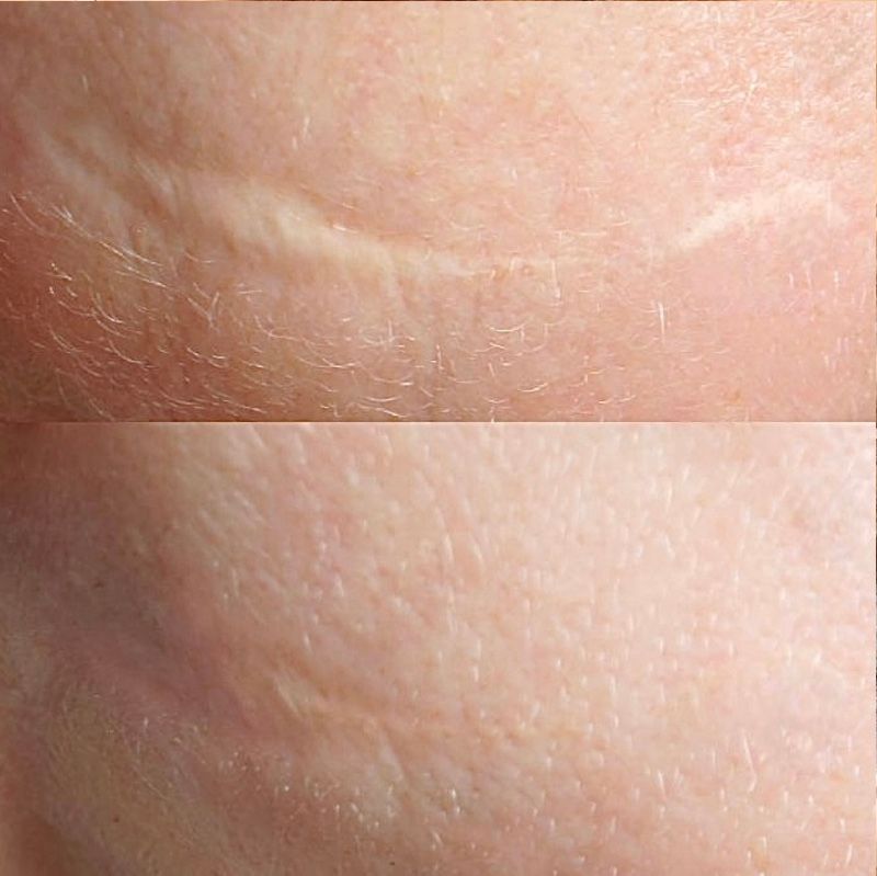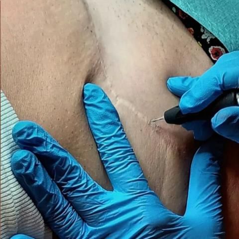 In diesen Videos sehen Sie, wie eine Behandlung aussieht. Mit winzigen Nadeln wird die Farbe in kreisförmigen kleinen Bewegungen in das Narbengewebe eingeführt. Die Behandlung wird mehrere Male (2-4 Termine) durchgeführt, bis das Resultat uns perfekt zufriedenstellt. Weitere Videos (auch mit Endergebnissen) folgen noch. Schauen Sie doch gern wieder rein.